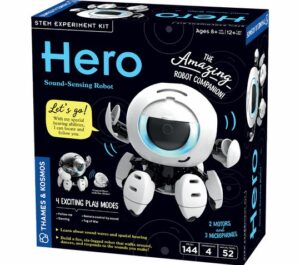 Hero: Sound Sensing Robot- Meet Hero the robot that listens & reacts to you! Clap, call, or use the castanet to control him through sound with 3 directional microphones, to follow /locate you, respond to voice-like commands, and challenge you in a tug-of-war game with four fun play modes, movable arms that tuck into his body, glowing expressive eye & comes from 100+ sturdy pieces Named 2025 Toy of the Year Finalist $64.95 Shop here thamesandkosmos.com